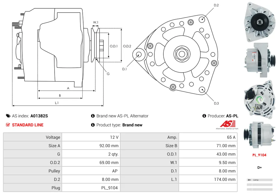 Ο Alternator AS-PL A01382S λειτουργεί στα 12V με ένταση 65A. Οι διαστάσεις του περιλαμβάνουν Size A 92.00 mm και Size B 71.00 mm. Η τροχαλία είναι τύπου AP με 2 αυλακώσεις και εξωτερική διάμετρο 43.00 mm. Οι διαστάσεις D.1 και D.2 είναι 8.00 mm και 8.00 mm αντίστοιχα. Το μήκος L.1 είναι 174.00 mm. Η φίσα του προϊόντος είναι τύπου PL_9104. Επιπλέον διαθέσιμα χαρακτηριστικά: Εξωτερική Διάμετρος 2 (mm) 69.00, W.1 (mm) 9.50.