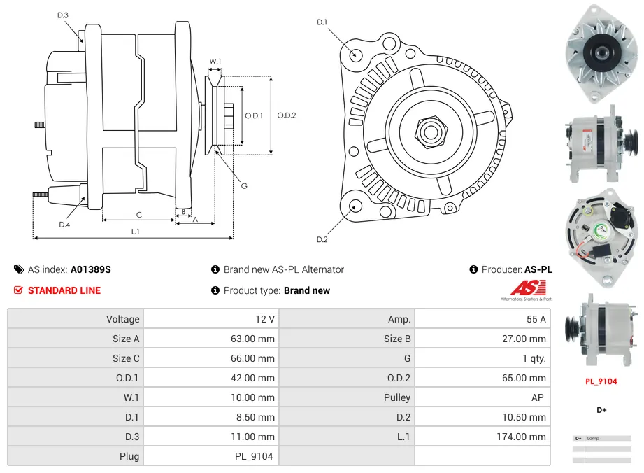 Ο Alternator AS-PL A01389S λειτουργεί στα 12V με ένταση 55A. Οι διαστάσεις του περιλαμβάνουν Size A 63.00 mm, Size B 27.00 mm και Size C 66.00 mm. Η τροχαλία είναι τύπου AP με 1 αυλακώσεις και εξωτερική διάμετρο 42.00 mm. Οι διαστάσεις D.1, D.2 και D.3 είναι 8.50 mm, 10.50 mm και 11.00 mm αντίστοιχα. Το μήκος L.1 είναι 174.00 mm. Η φίσα του προϊόντος είναι τύπου PL_9104. Επιπλέον διαθέσιμα χαρακτηριστικά: Εξωτερική Διάμετρος 2 (mm) 65.00, W.1 (mm) 10.00.