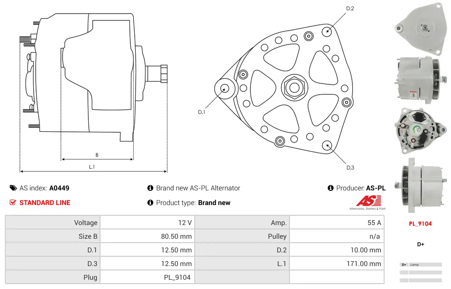 Ο Alternator AS-PL A0449 λειτουργεί στα 12V με ένταση 55A. Οι διαστάσεις του περιλαμβάνουν Size B 80.50 mm. Η τροχαλία είναι τύπου n/a. Οι διαστάσεις D.1, D.2 και D.3 είναι 12.50 mm, 10.00 mm και 12.50 mm αντίστοιχα. Το μήκος L.1 είναι 171.00 mm. Η φίσα του προϊόντος είναι τύπου PL_9104.